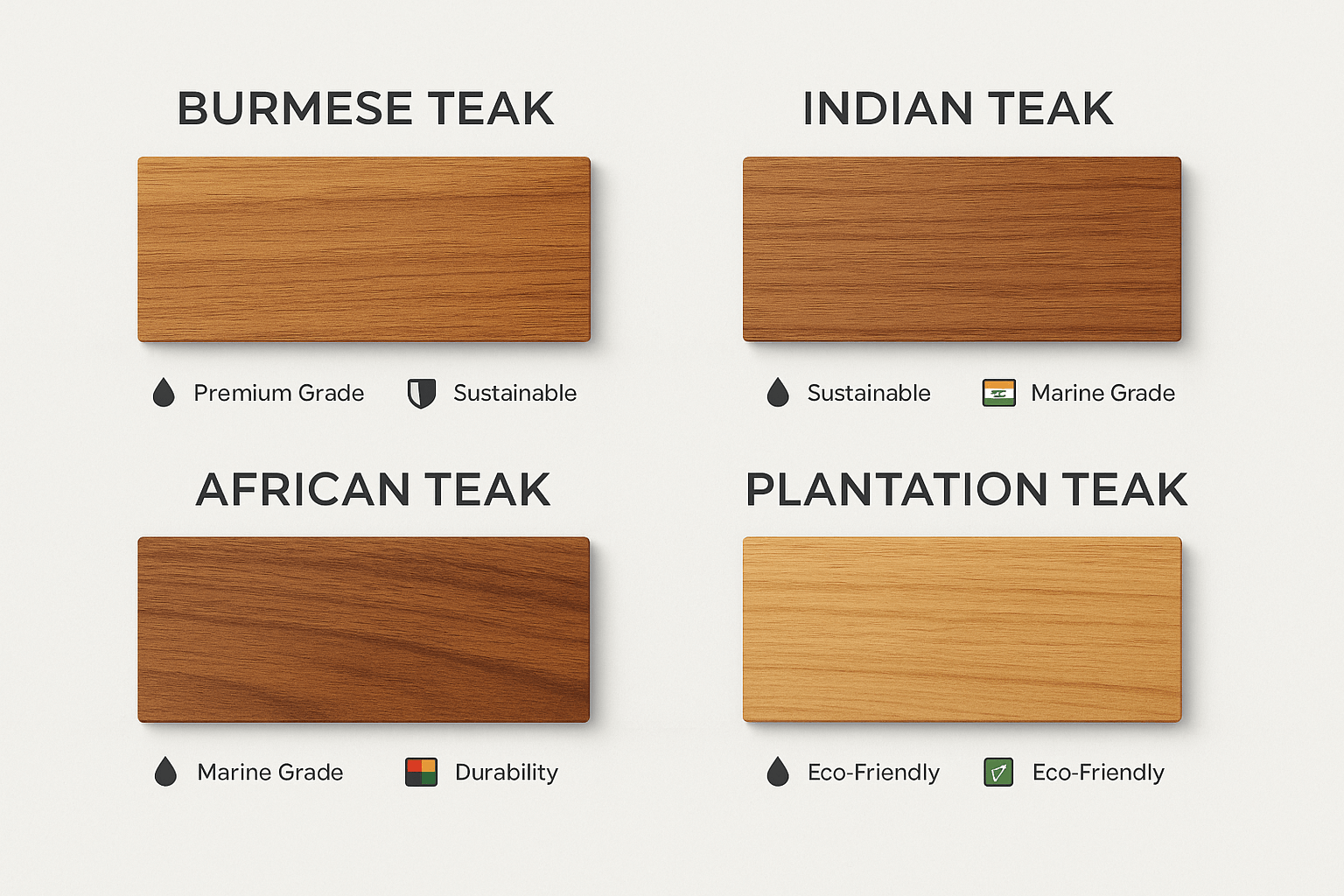 Types of Teak Wood: Burmese teak offers the highest oil content and durability, while plantation teak provides a sustainable alternative. Each variety has distinct characteristics that make them suitable for different applications, from premium yacht construction to eco-friendly outdoor furniture.